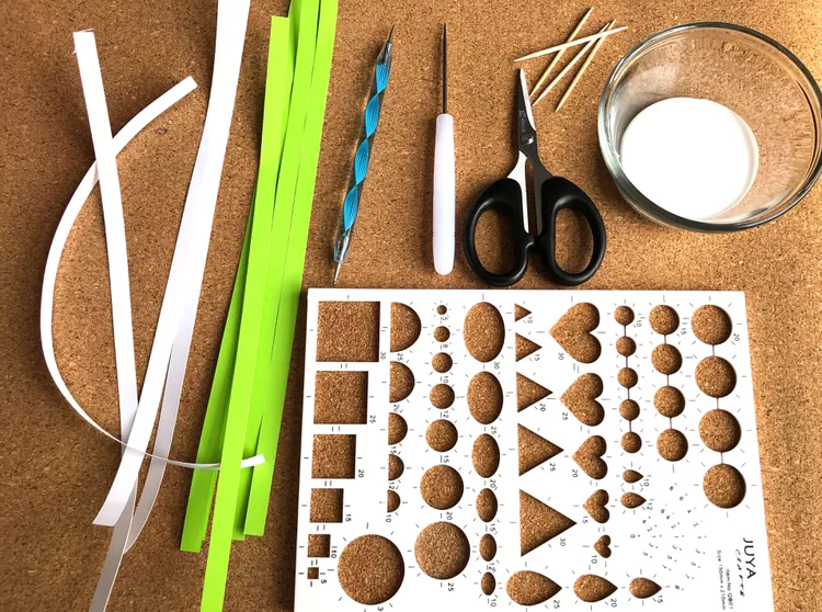 Step 1: Gather your materials: quilling paper, quilling tool, glue, and a card base.